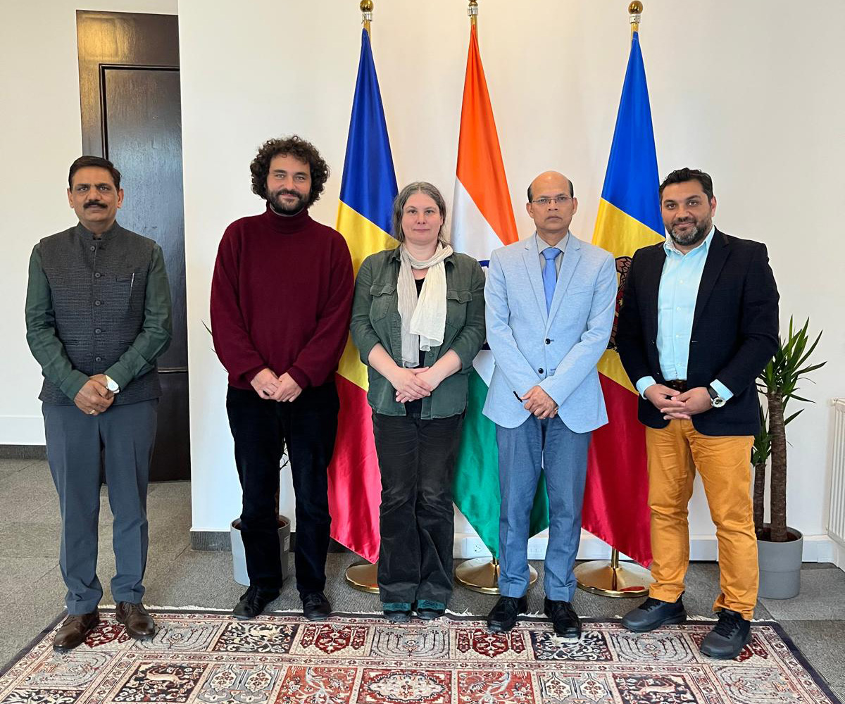 Ieri, 8 aprilie, reprezentanții programului de Studii Religioase – Texte și Tradiții și ai programului de Limba și Literatura Rromani din cadrul Facultății de Limbi și Literaturi Străine a Universității din București, au avut bucuria și onoarea de a se întâlni cu Excelența Sa, Dr. Manoj Kumar Mohapatra, Ambasadorul Indiei la București. Întâlnirea a avut loc la noul sediu al Ambasadei Indiei din strada Grigore Alexandrescu nr. 86.La întâlnire au participat, alături de Excelența Sa, Ambasadorul Indiei: domnul Mahesh Chand – Secretar II la Ambasada Indiei, doamna Prof. dr. habil. Madeea Axinciuc – director al programului masteral de Studii Religioase – Texte și Tradiții, domnul Lect. dr. Alexandru Zamfir – programul de Limba și Literatura Rromani și domnul Drd. Ciprian Baciu – programul de Studii Religioase – Texte și Tradiții.